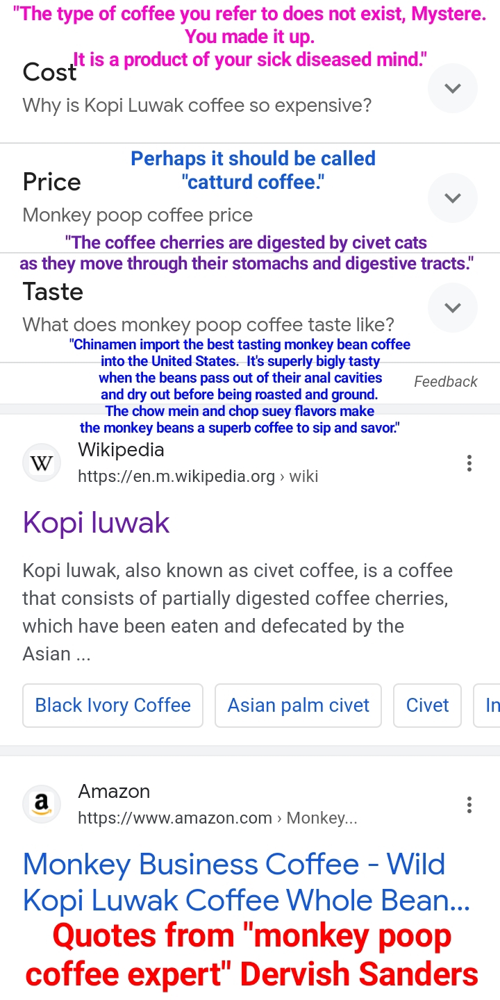 Update: Assface Dervish Sanders has been running his piehole about "monkey poop coffee." So here's a screenshot and some comments posted on the screenshot.